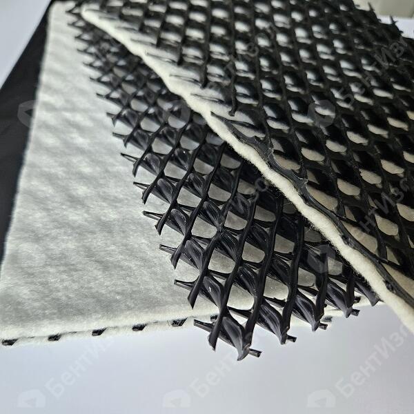 Ядро материала — это объемная геосетка с ромбовидным расположением прутков в трех направлениях, изготовленная из первичного полиэтилена методом экструзии.