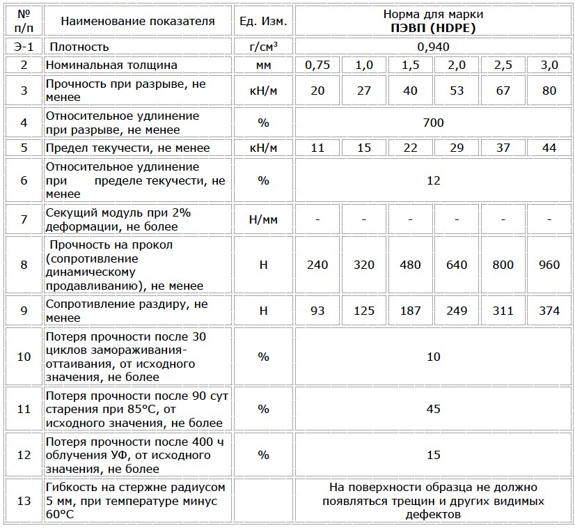 Технические характеристики гладкой геомембраны BentIzol® GM марки ПЭВП (HDPE)