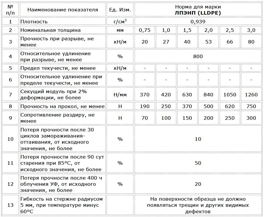 Технические характеристики гладкой геомембраны BentIzol® GM марки ЛПЭНП (LLDPE)