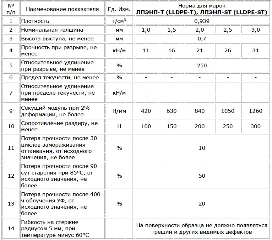 Технические характеристики гладкой геомембраны BentIzol® GM марок ЛПЭНП-Т (LLDPE-T), ЛПЭНП-1Т (LLDPE-ST)